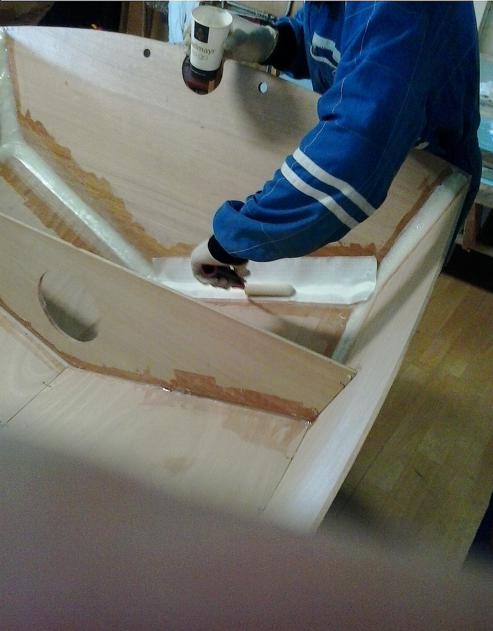 Během kurzu jsme já a další lidé překreslili plány mé lodičky na překližku pomocí hřebíčků a spline latěk, vyřízli, navrtali kolem hran otvory a "sešili" trup měděným drátem. Spoje jsme vytmelili tmelem z pryskyřice (Havel 324 + tvrdidlo H 25 + plnidlo (mikrocelulóza : bavlněná vlákna mletá : Aerosil (4:6:3 objemově))), a poté překryli skelnou páskou (Aeroglass 140g/m2, šířka 10cm) a zalaminovali laminační pryskyřicí (Havel LH 160 + tvrdidlo H 147).